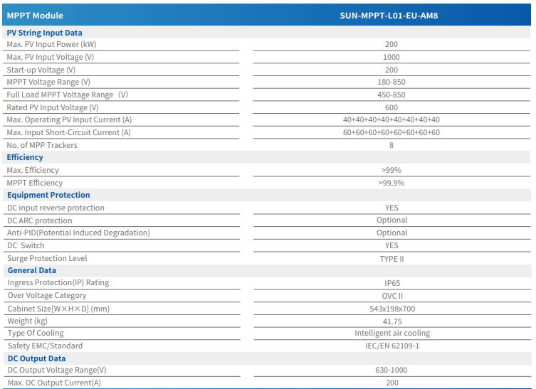 Moduł SUN-MPPT-L01-EU-AM8 to wysokowydajne rozwiązanie MPPT, idealne do dużych instalacji PV w systemach ESS – dzięki 8 niezależnym trackerom, szerokiemu zakresowi napięcia oraz ekstremalnie wysokiej sprawności umożliwia maksymalne wykorzystanie mocy PV. Ponadto wzmocniona konstrukcja IP65, ochrona przeciw przepięciom i możliwość pracy w szerokim zakresie temperatur zapewniają wydajność i niezawodność w różnych warunkach eksploatacyjnych.