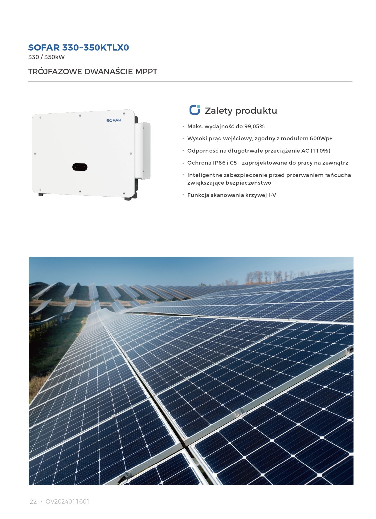 Sofar serii KTLX0 to trójfazowy, nowoczesny, wysokoprądowy inwerter, który doskonale sprawdzi się do budowy farmowych i przemysłowych instalacji fotowoltaicznych. Ma 8 niezależnych wejść MPPT, wysokoprądowych, szereg zabezpieczeń elektrycznych, a stopień szczelności IP66 oraz antykorozyjnej C5 umożliwia montaż inwertera na zewnątrz, w niesprzyjających warunkach, nawet w zasolonej atmosferze i to do 5000 m nad poziomem morza. Falownik doskonale pracuje z każdymi modułami PV a dodatkowo z wysokoprądowymi panelami o mocy od 500 W.