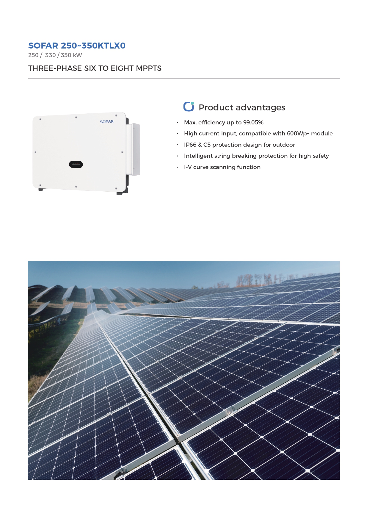 Sofar serii KTLX0 to trójfazowy, nowoczesny, wysokoprądowy inwerter, który doskonale sprawdzi się do budowy farmowych i przemysłowych instalacji fotowoltaicznych. Ma 8 niezależnych wejść MPPT, wysokoprądowych, szereg zabezpieczeń elektrycznych, a stopień szczelności IP66 oraz antykorozyjnej C5 umożliwia montaż inwertera na zewnątrz, w niesprzyjających warunkach, nawet w zasolonej atmosferze i to do 5000 m nad poziomem morza. Falownik doskonale pracuje z każdymi modułami PV a dodatkowo z wysokoprądowymi panelami o mocy od 500 W.
