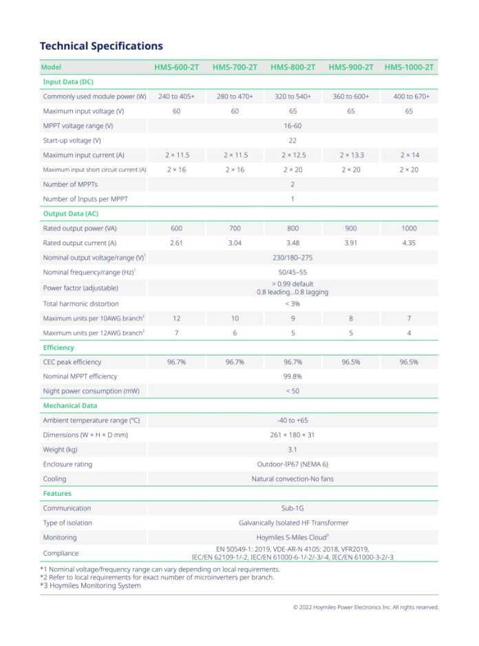 Reaching up to 2,000VA output power, the new Hoymiles HMS-2000 microinverter ranks at the forefront of 4-in-1 microinverters. Up to four PV modules can be connected to each microinverter with independent MPPT and monitoring, allowing for greater energy efficiency and easier use.