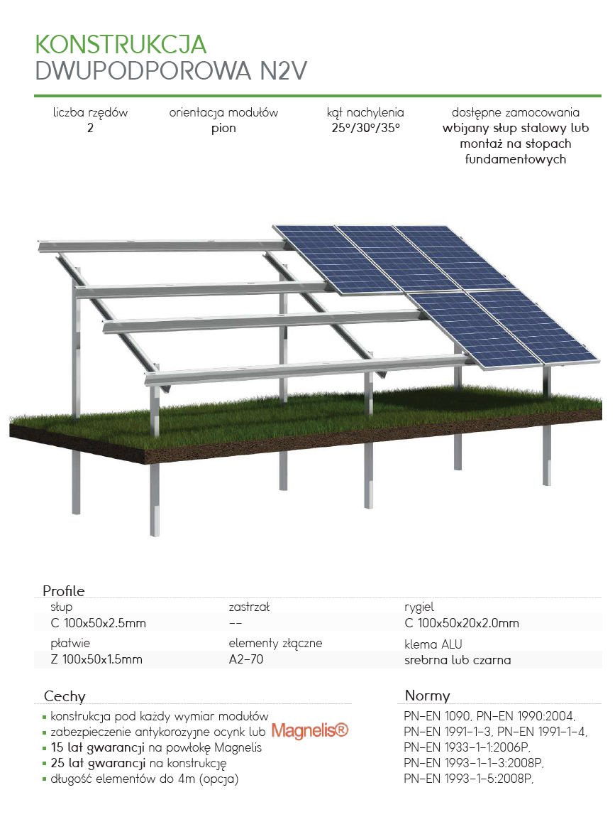 Stanowi samodzielną konstrukcję montażową na gruncie dla szeregu paneli fotowoltaicznych ułożonych pionowo (2 szt. jeden nad drugim), z  nachyleniem około 25/30/35°.