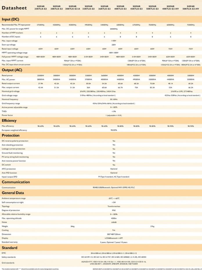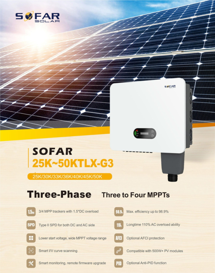 SOFAR 25KTL-X-G3 trójfazowy inwerter z potrójnym MPPT posiada maksymalne napięcie wejściowe DC 1100V, możliwość długotrwałego przeciążenia do 110%, SPD typu II dla prądu DC i AC. Jest kompatybilny z modułami fotowoltaicznymi powyżej 500W.